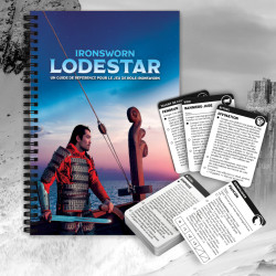 Lodestar est le guide dédié au jeu Ironsworn. Il contient des rappels des règles importantes et des oracles, pour Ironsworn mais aussi –spécialement pour la VF– pour son supplément Delve. Il vous permettra donc de vous référer, voire de jouer n'importe où sans avoir à transporter en permanence Ironsworn et Delve dans votre sac.